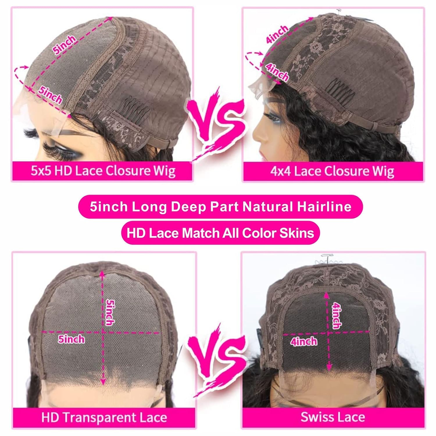 🌺 3、5×5 HD Lace Closure Wigs Features : 5X5 HD LACE FRONT WIGS HUMAN HAIR , Lace Area 5×5″. Breathable, Comfortable, Soft, Invisible. Wig Cap Size 22.5″. Medium Cap Size with Adjustable Straps, 4 Combs Inside, Fixed Position, Easy to Adjust &Fit, Wear Comfortable. Careful Maintenance Makes the Cycle Longer.HD Invisible bleached knots, match your skin well.