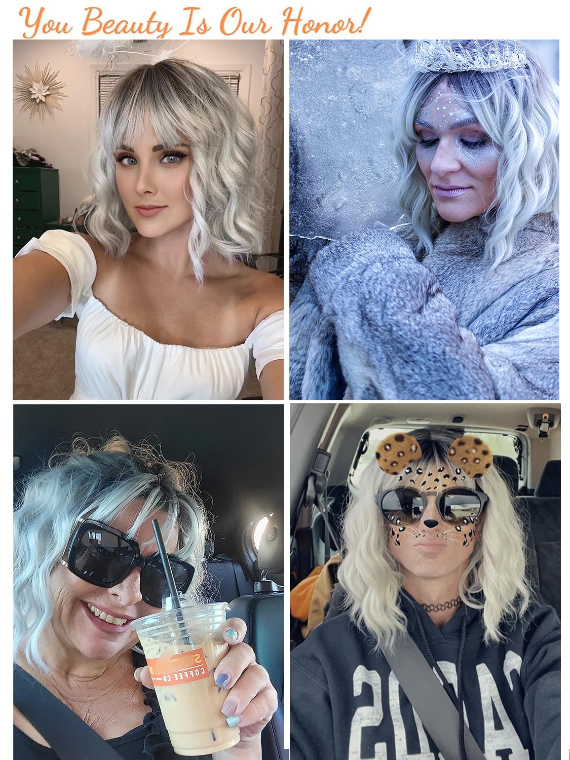 BESTUNG Short White Silver Wigs for Women Ombre Grey Wavy Bob Wig with Bangs Medium Length Synthetic Hair Water Wave Dark Roots Wig Gray Colorful Wigs(12 Inches)Create a new description for this product from the title with 500 characters