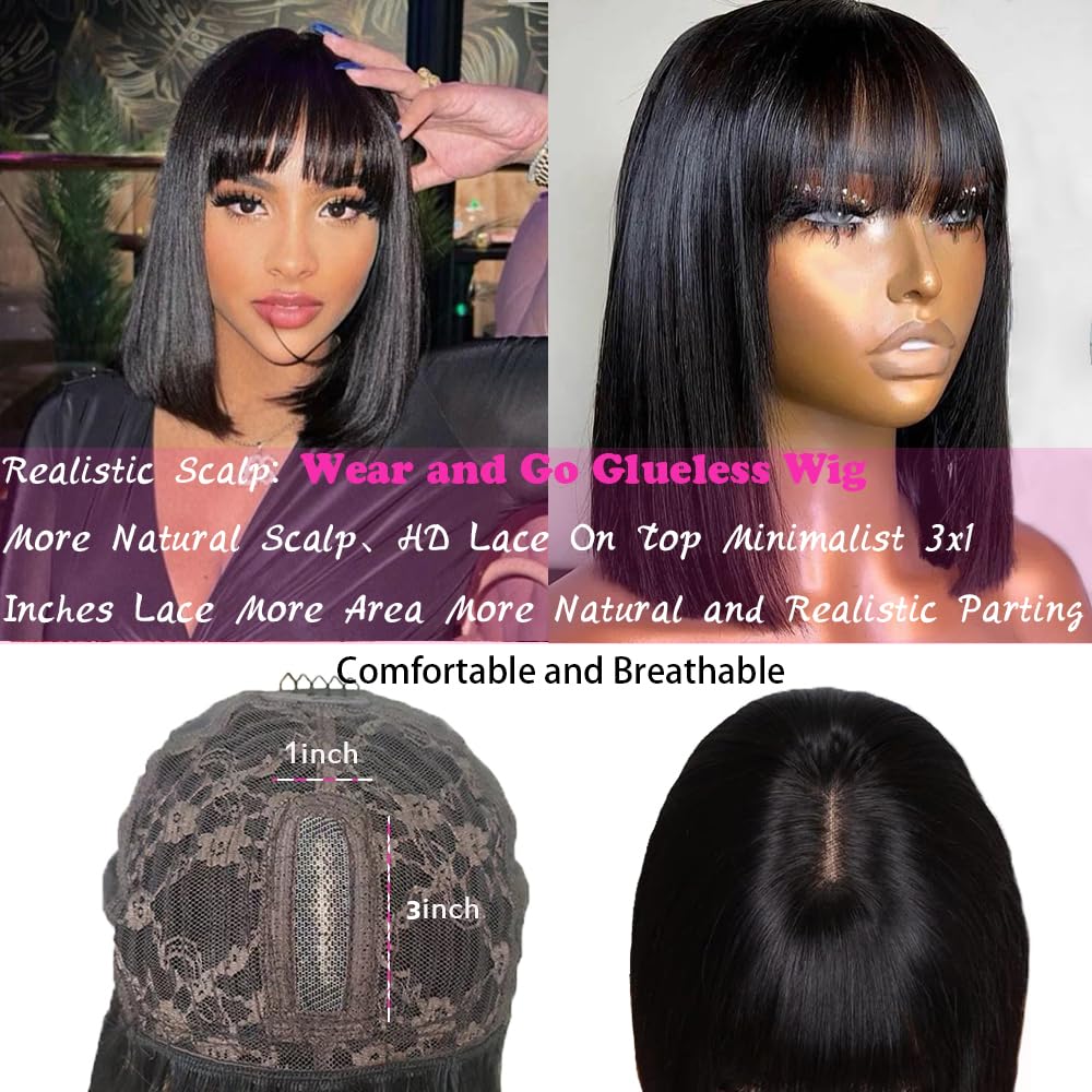 💋Straight Human Hair Bob Wig with Bangs: Realistic Scalp Minimalist Undetectable Lace on Top, More Lightweight and Comfortable Than Other Wig Caps.