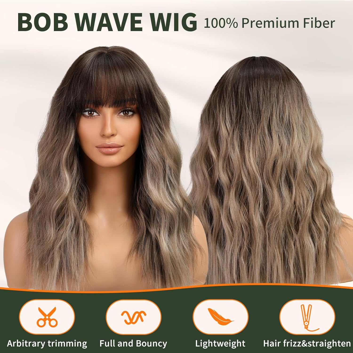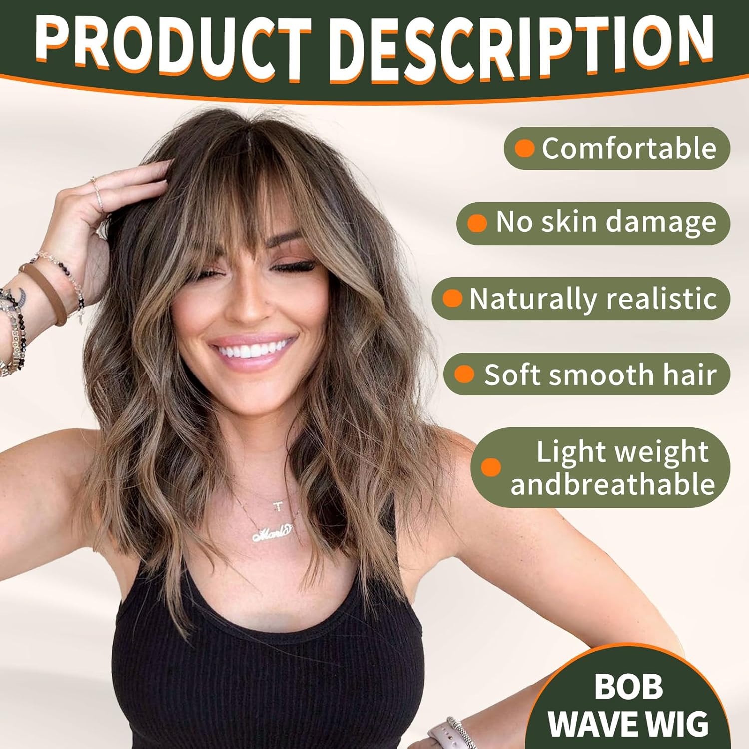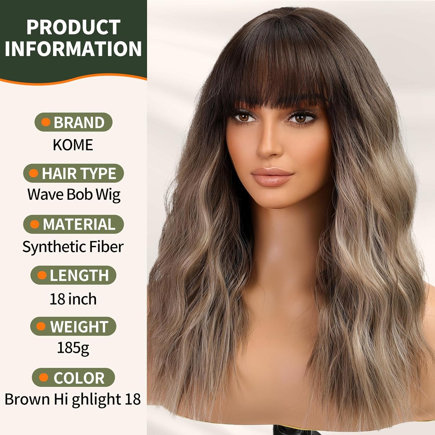 KOME Brown Wig with Bangs,Brown Highlight Wavy Wigs for Women,Shoulder Length Curly Synthetic Hair Wig for Party Daily Use 18INCreate a new description for this product from the title with 500 characters
