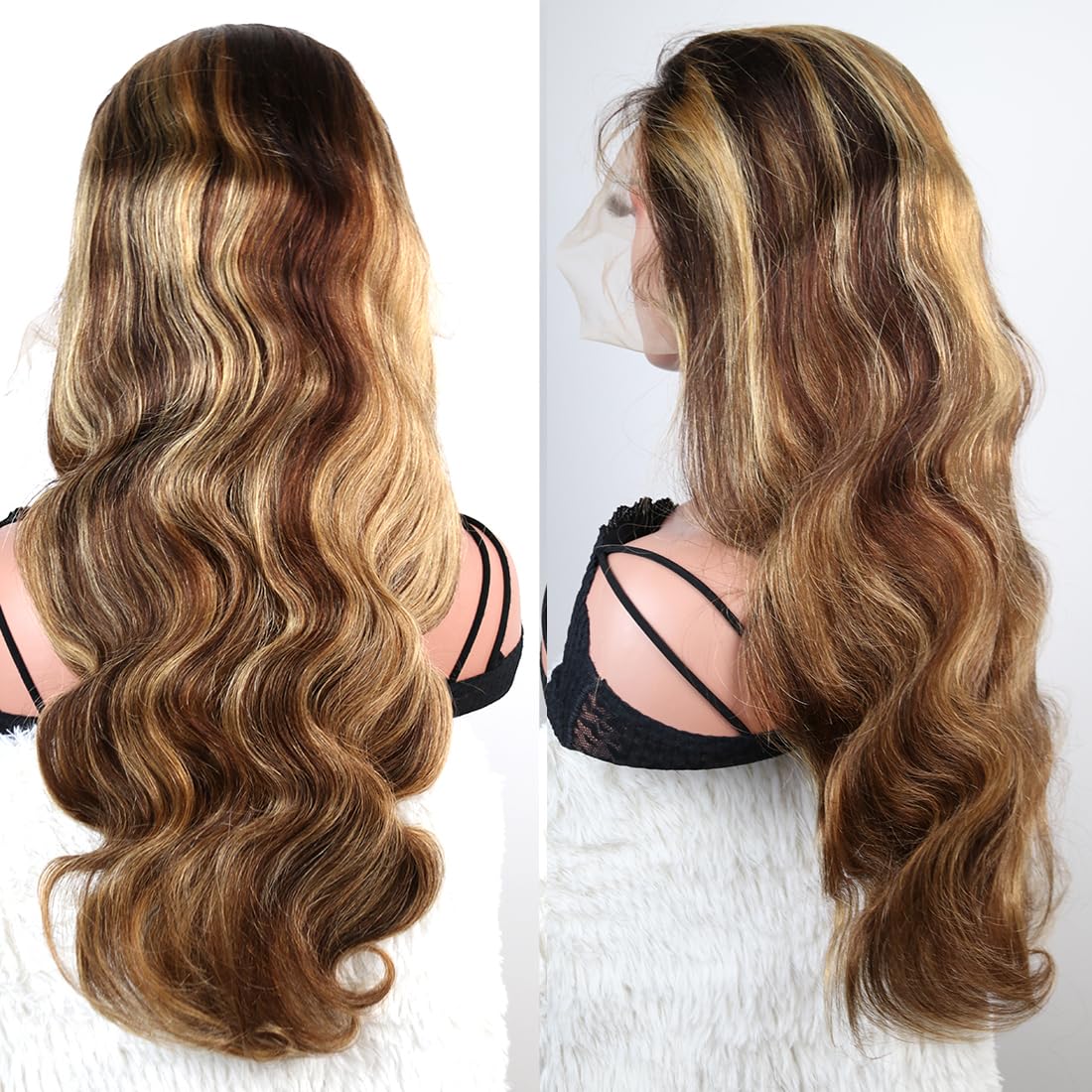 SWEETGIRL 13×6 Highlight Lace Front Wigs Human Hair Body Wave Hd Lace Frontal Wigs 4/27 Honey Blonde Ombre Colored Human Hair Wigs for Women Pre Plucked 180 Density 24 Inch